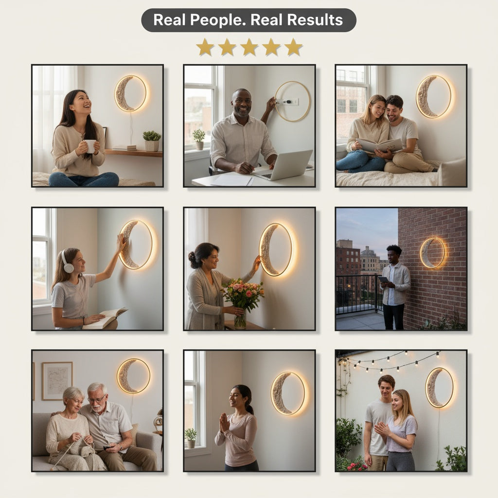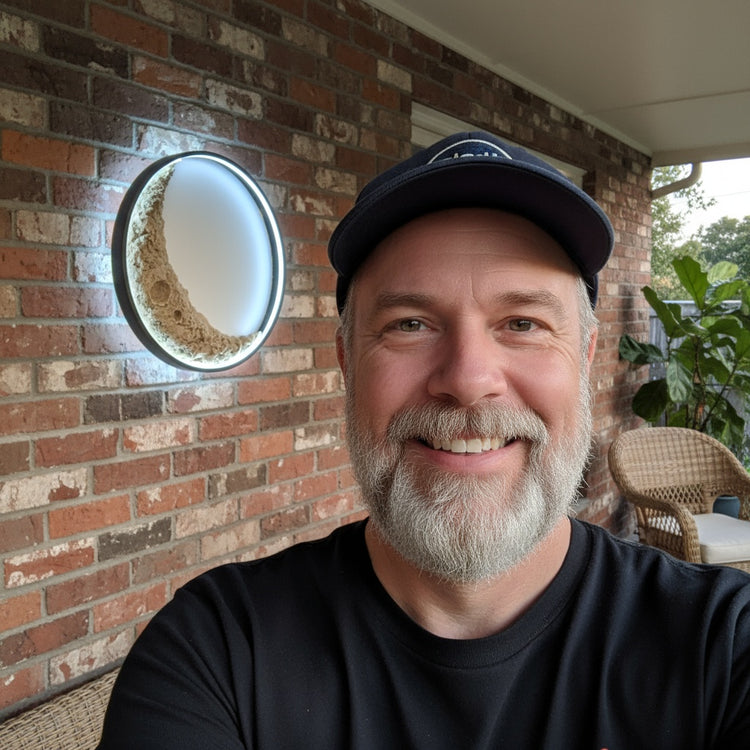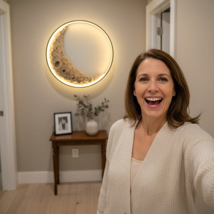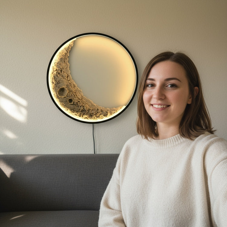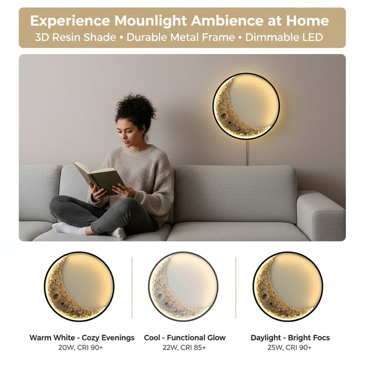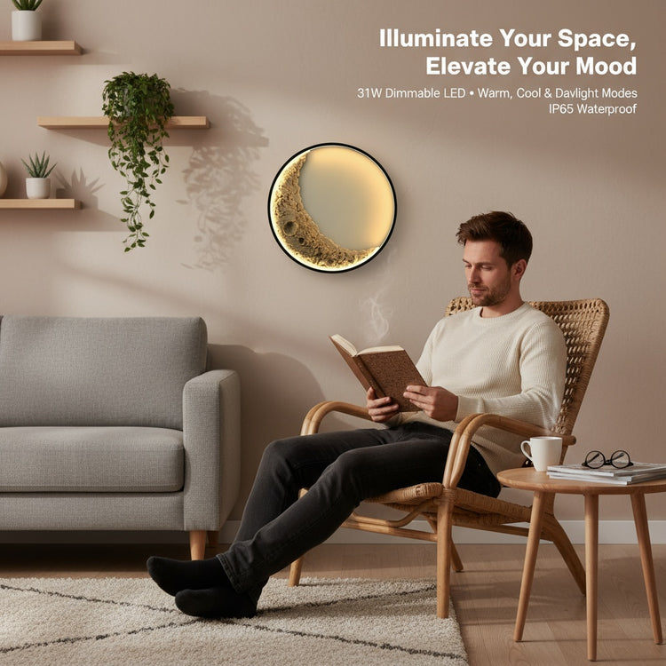 Explore how this lamp casts a soft lunar glow in living rooms, bedrooms, and patios. See the realistic texture come to life under three color modes.